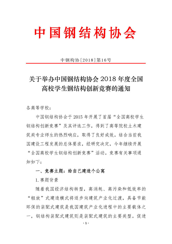 关于举办中国钢结构协会2018年度全国高校学生钢结构创新竞赛的通知