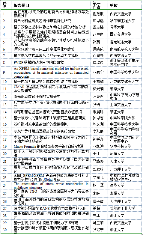 为加强学术交流、鼓励科学研究、促进力学学科青年人才成长,中国力学学会在中国力学大会2019召开期间组织开展“中国力学大会2019优秀墙报奖”评奖活动。评选工作遵循“科学公正、注重创新、严格筛选、宁缺毋滥”的原则进行。经专题推荐、专业委员会现场评审等环节,共评选出优秀墙报30篇,并在大会现场颁奖。