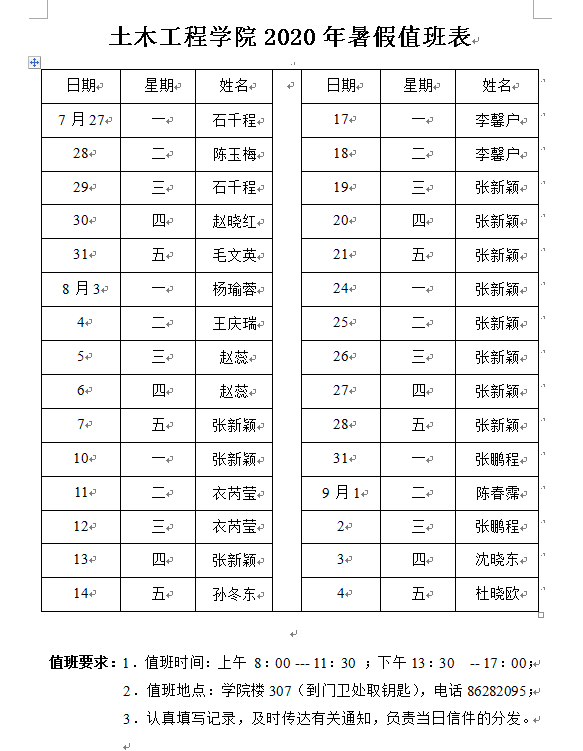 假期每周一至周五学院安排人员值班,请值班人员按照要求按时值班并处理事务。办公室值班电话:86282095。